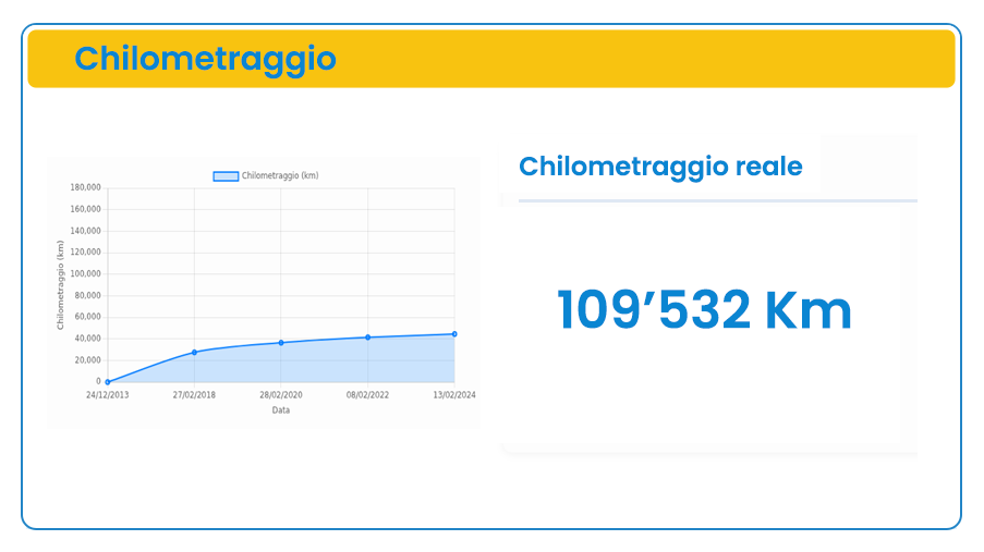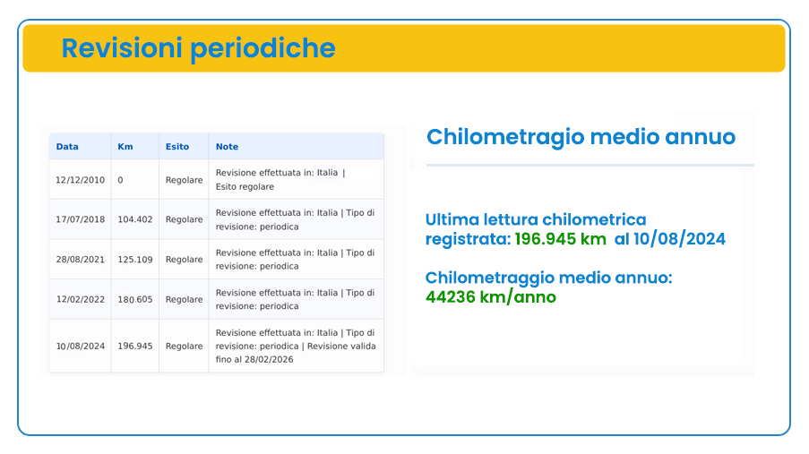 Controlla la coerenza del chilometraggio e delle REVISIONI nel tempo per identificare eventuali manomissioni del contachilometri.