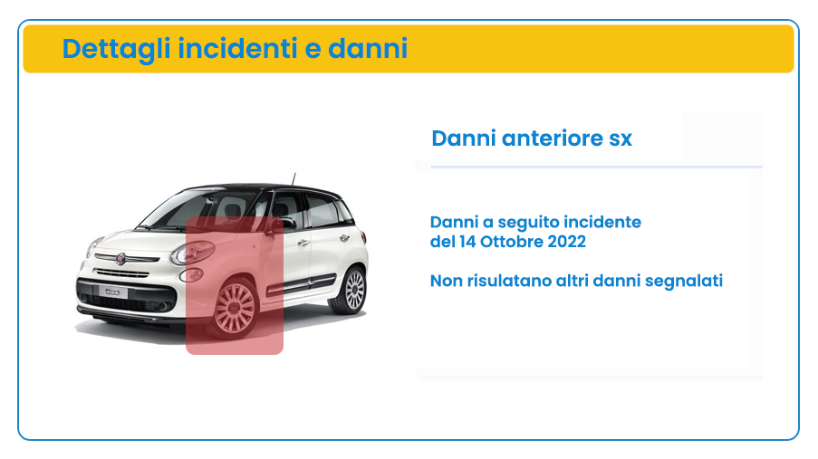 Il nostro report auto mostra eventuali danni registrati, inclusi sinistri gravi, danni strutturali o riparazioni costose, aiutandoti a valutare lo stato reale dell’auto.